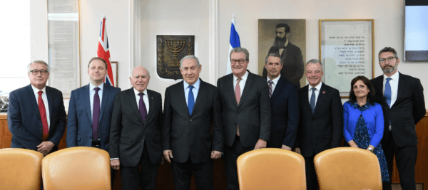 (From L-R) Former Australian treasurer Wayne Swan [Labor], chair of the Zionist Federation of Australia (ZFA) Jeremy Liebler, former Australian prime minister John Howard [Liberal], Prime Minister Benjamin Netanyahu, former Australian foreign minister Alexander Downer [Liberal], former Australian communications minister Stephen Conroy [Labor], former Australian defense minister Brendan Nelson [Liberal], Ginette Searle ZFA Executive and Australian Ambassador Chris Cannan meet in the Prime Minister’s Office in Jerusalem on October 28, 2019. (Amos Ben Gershom/PMO) [A bipartisan tugging of the forelock, visit organized by the Zionist Federation of Australia]