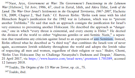 ‘Rivlin took issue with his idol Menachem Begin’s justification for the 1982 war in Lebanon, which was to “prevent another Treblinka.” He said that such an approach consigns the justification for Israel’s very existence to preventing another Holocaust. He described the approach as “dangerous,” one in which “every threat is existential, and every enemy is Hitler.” He decried the division of the world to either “righteous gentiles or anti-Semitic Nazis,” a separation that transforms any criticism against Israel to an expression of anti-Semitism. Instead, Rivlin offered what he described as “a third way” that combines the Israeli vow of never again, accentuates Jewish solidarity throughout the world and adopts the Jewish value of respecting all men and women, regardless of their religion or race.’ Shalev, Chemi, ‘Rivlin Uses Holocaust Day to Challenge Netanyahu’s Darkness and Despair,’ Haaretz, 25 April 2017, via https://www.haaretz.com/israel-news/.premium-1.785389, accessed12 January 2018.