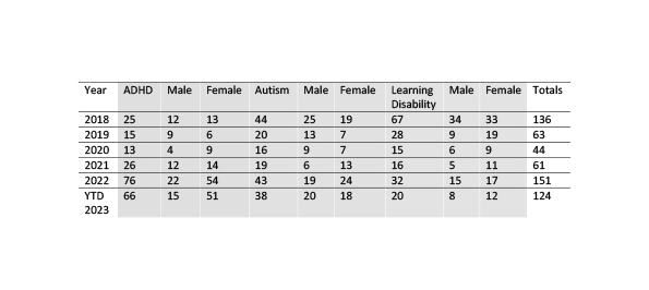Here are the numbers for registrations with the Disability Liason Access Unit for support under ‘reasonable adjustments’ legistation by year; estimates based on ABS statistics for people who are neurodiverse suggests Fed has anywhere between 800-1000 ND students and staff. As you can see the numbers are held up by things like the fact that registration with the DLAU requires a diagnosis, which typically costs a few thousand bucks in the middle of rolling cost-of-living and housing affordability crises.